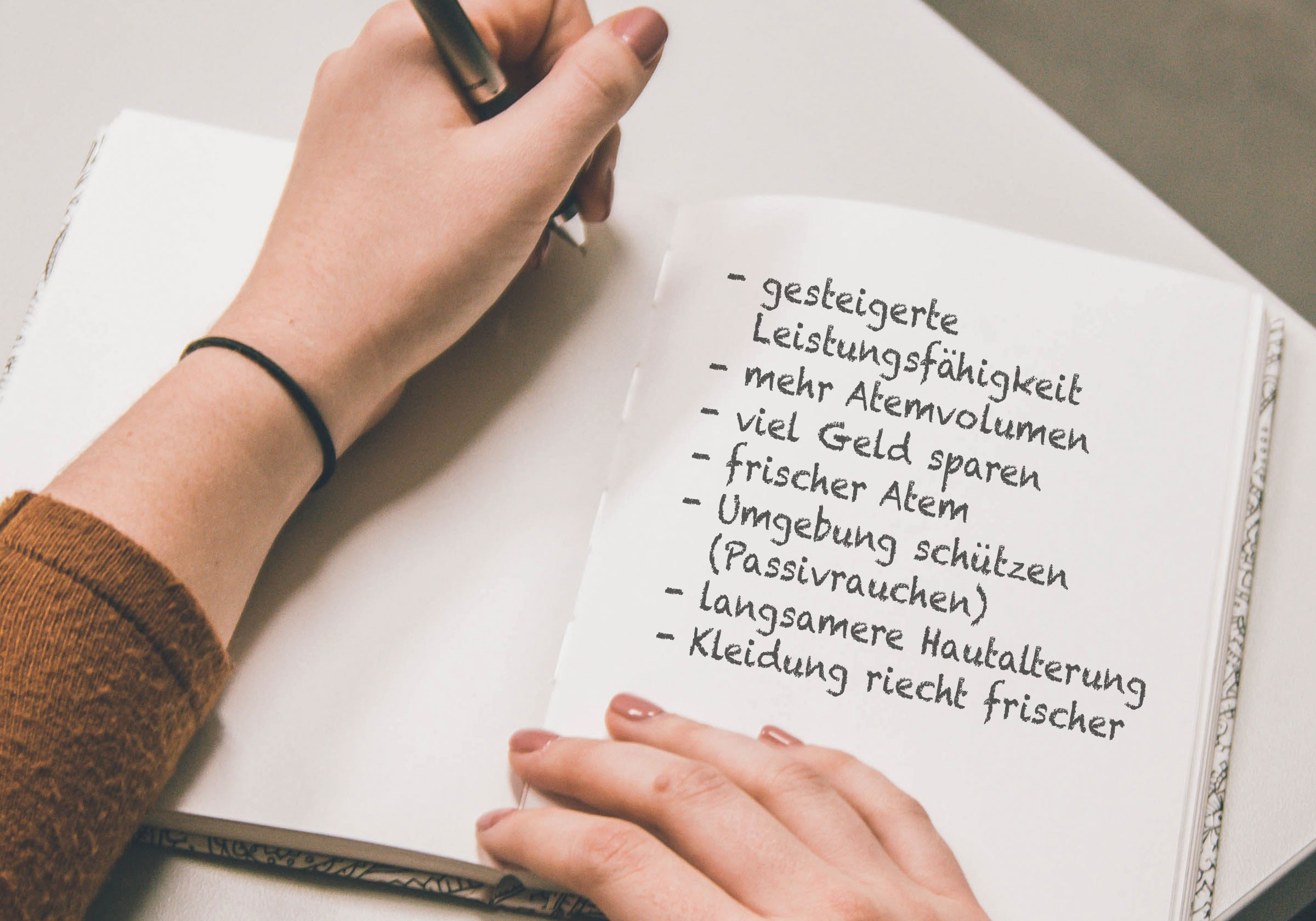 Als Raucher haben Sie positive Aspekte mit dem Rauchen verknüpft, z. B. Entspannung, Abschalten oder Genuss. Wenn Sie den Entschluss gefasst haben, mit dem Rauchen aufzuhören, müssen Sie dafür sorgen, dass Ihr Fokus auf den negativen Effekten liegt. Beantworten Sie sich folgende Fragen – nehmen Sie sich Zeit und seien Sie dabei wirklich ehrlich zu sich selbst. Kehren Sie zu dieser Liste während des Aufhörens immer wieder zurück, um daraus Kraft und Motivation zu ziehen: Welche Vorteile bringt mir das Rauchen? Was sind die negativen Aspekte des Rauchens für mich? Was gewinne ich in meinem Leben dazu, wenn ich aufhöre zu rauchen?