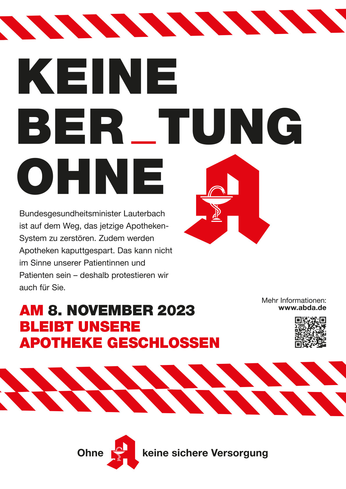 Einbeck, 03.11.23 – Am Mittwoch, dem 8. November 2023, bleiben viele Apotheken in Niedersachsen und ganz Norddeutschland geschlossen. Damit weisen die Apothekerinnen und Apotheker auf anhaltende Missstände in der Arzneimittelversorgung hin. Auch Einbecker Apotheken werden am 8. November geschlossen sein. Die Notfallversorgung wird am Protesttag über die Notdienstapotheken gewährleistet. Es wird empfohlen, regelmäßig benötigte Medikamente vorausschauend an anderen Tagen zu besorgen. Am Protesttag versammelt sich die niedersächsische Apothekerschaft mit Kolleginnen und Kollegen aus Bremen, Hamburg, Schleswig-Holstein und Mecklenburg-Vorpommern zu einer zentralen Kundgebung auf dem Ernst-August-Platz in Hannover, um ihren Forderungen Nachdruck zu verleihen.