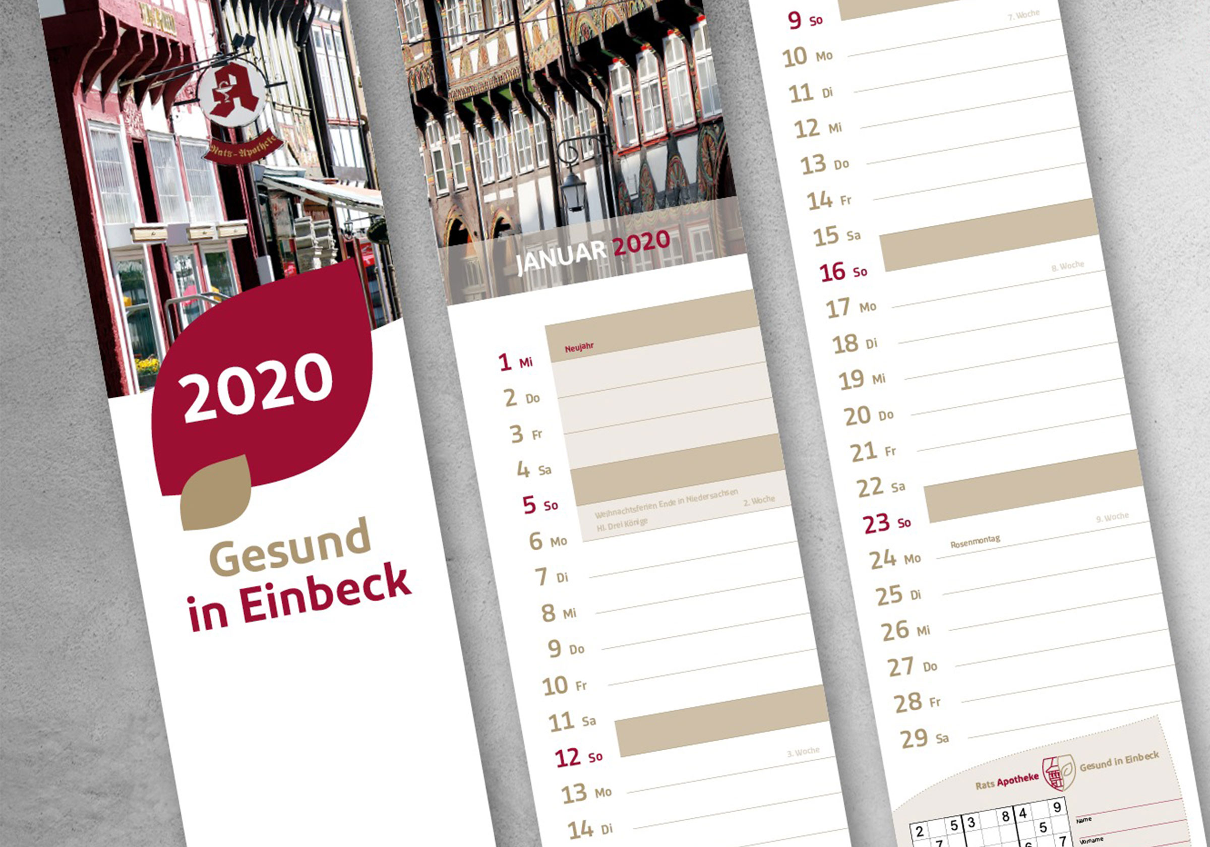 Kommen Sie auch 2020 gesund durchs Jahr mit Ihrer Rats Apotheke. Neben der praktischen Monatsübersicht hält unser Streifenkalender wunderschöne Ansichten aus Einbeck, nützliche Tipps und attraktive Gutscheine für Sie bereit.