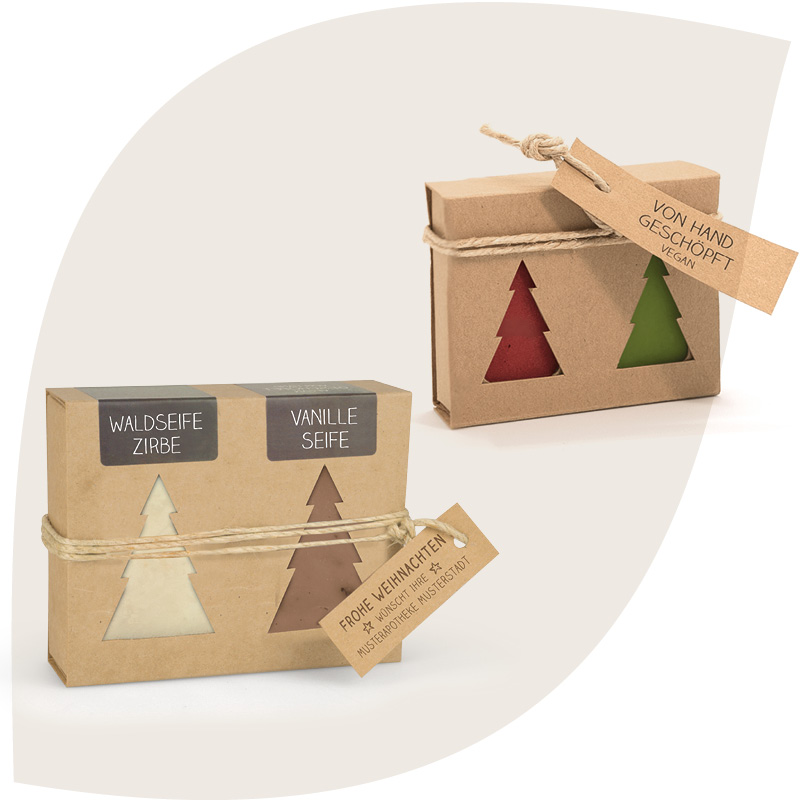 Beeindrucken Sie Ihre Lieben mit handgeschöpften veganen Seifen in weihnachtlicher Optik und mit stimmungsvollen Duftrichtungen: Bratapfel und Latschenkiefer (2 x 25 g), sowie Waldseife Zirbe und Weihnachtsseife (2 x 100 g).